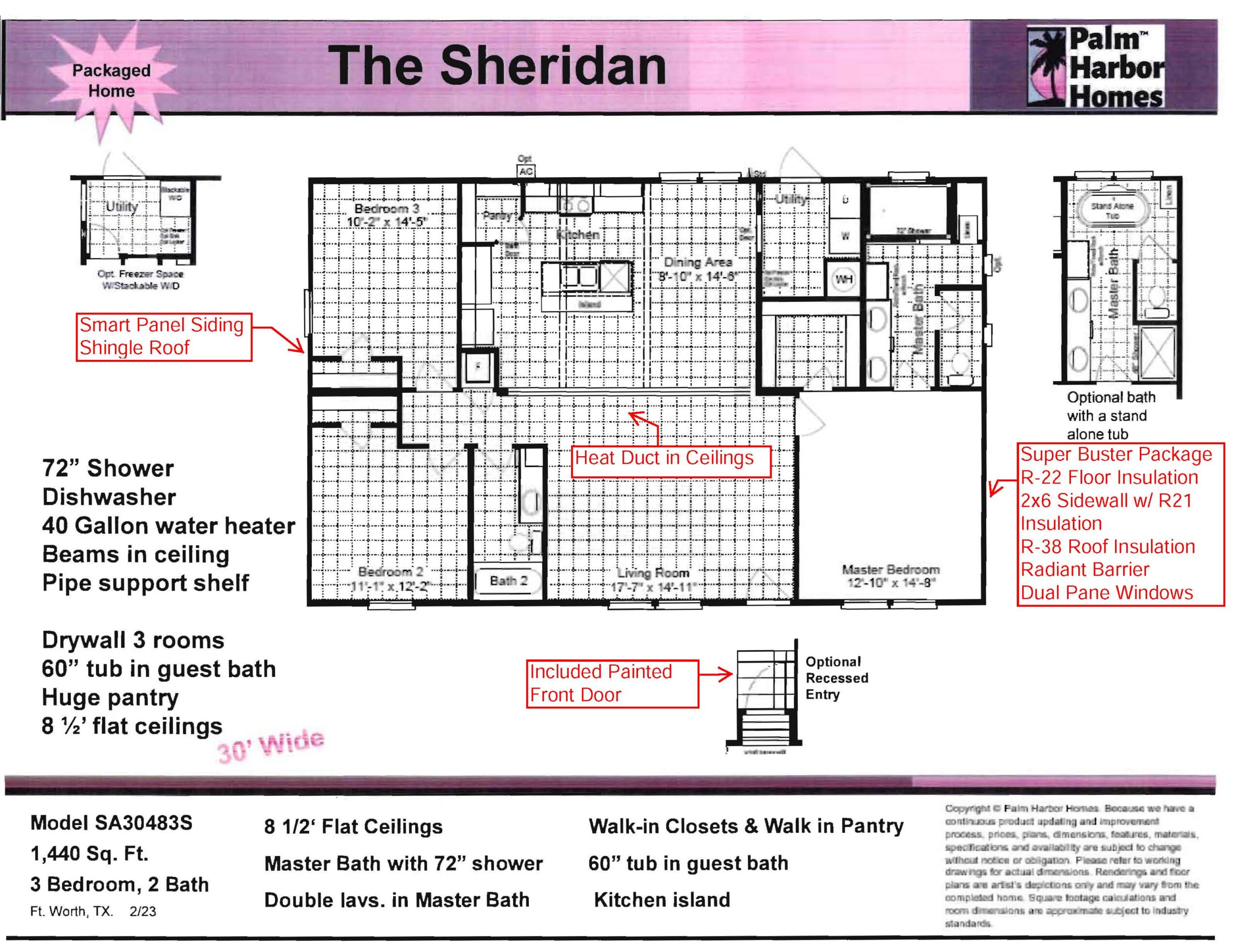NO Batten Strips: The walls on this home are Smooth Coat T&T. Smart Panel Siding with Metal Roof, Zone 2 Insulation Package with Insulated Windows. 50 Gallon Water Heater, the Heat Ducts are in the ceilings. 60″ Shower in master bath with China sinks. Dishwasher and wired and braced for ceiling fans.