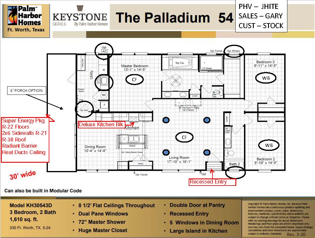 Homeland 30544H manufactured home from Palm Harbor Homes features 4 bedrooms, 2 baths and 1620 square feet of living space. J Hite’s Engery Buster Pkg features 2×6 sidewall with R-19 Insulation, R-11 Floor Insulation, R-30 Roof Insulation with Radiant Barrier to lower you A/C cost up to 17% monthly. Tape and Textured Wall except the wet areas. Lino throughout. Heat Ducts in the ceiling. Side by Side Black Refer with Ice and Water, Smooth top Range, and Microwave over the Range. Wood Cabinet Doors. Large Pantry with space for Freezer.